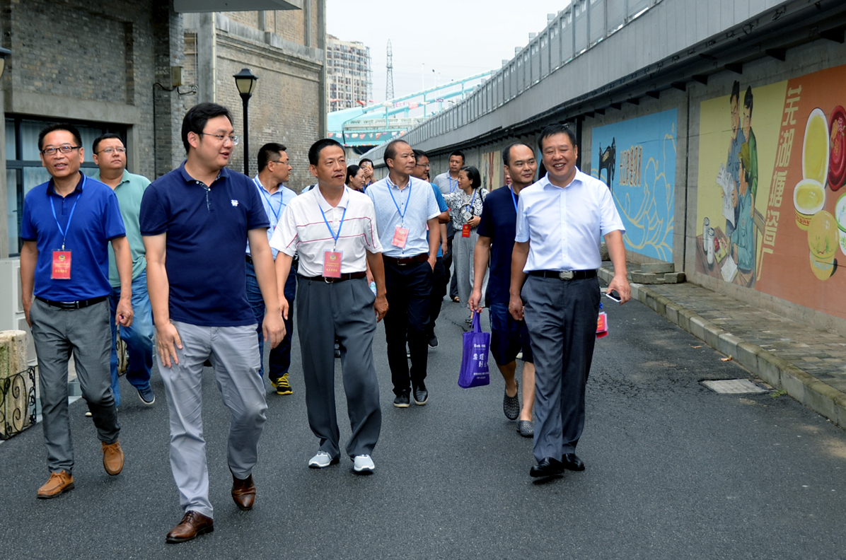 卞總向調研團匯報了園區的歷史傳承、改造歷程及目前的基本發展情況。帶領參觀了益新面粉大樓及大礱坊歷史文化長廊,作為蕪湖工業象征的“兩個半煙囪”的僅存見證,百年益新面粉大樓在經過修整后也再次踏上新的征程。而在今年8月正式竣工的大礱坊歷史文化長廊,利用墻繪的方式,生動的記錄了礱的誕生以及大礱坊的工業歷史變遷,長達450米的手工墻繪,目前已成為蕪湖的一張文化名片。
